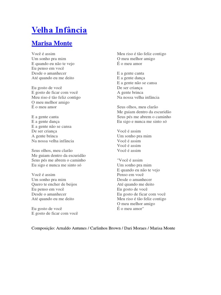 E a gente canta e a gente dança e a gente não se cansa de ser criança a gente brinca na nossa velha infância. Porque ele sempre volta. O meu melhor amigo é o meu amor beatriz marques.