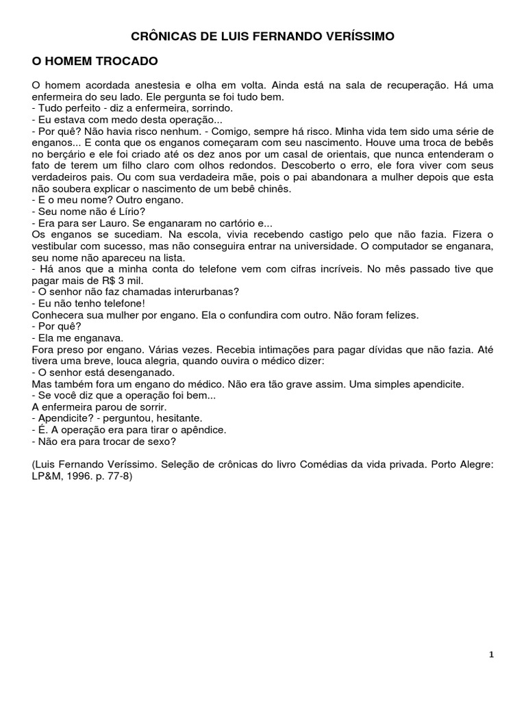 Atividade de produção de texto crônica de luis fernando veríssimo motivando o reconto6º ao 9º ano a criação de um texto a partir de um outro texto já existente intertextualizando buscando através do humor e de textos de interesse dos alunos tornar a leitura um momento de prazer e dessa forma criar o hábito e o gosto por. As pessoas que querem compartilhar as visões religiosas delas com você quase nunca querem que você compartilhe as suas com elas. Dez coisas que levei anos para aprender.
